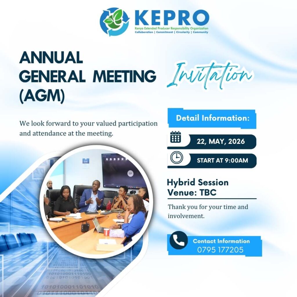 Dear Member, NOTICE is hereby given that the 5th Annual General Meeting (AGM) of the Members of the Kenya Extended Producer Responsibility Organization (KEPRO) will be convened on Friday, 22nd May 2026 at 9:00 a.m. The meeting will be conducted in a hybrid format, comprising both an in-person session (venue to be confirmed) and a virtual session via the Microsoft Teams teleconferencing platform.